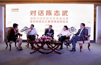 7月16日下午,宜信财富长三角高端巡回论坛合肥站——对话陈志武“破除中国经济未来发展迷雾”在稻香楼宾馆举行。余竹云董事长应邀出席论坛,并在圆桌讨论会上,与陈志武教授就当下中国经济未来面临怎样新挑战和动力等问题进行了讨论交流。