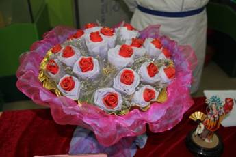新东方厨师教授大家捏面塑玫瑰花是重点,男士们为了表达自己对她的爱,非常认真用心地学习捏面塑玫瑰花的方法,经过五分钟的激烈角逐,5名男士都完成了自己的作品,不管是蓝色还是大红色,最后男士们的作品都被拿上了舞台,因为大家是第一次接触学习,可能没有老师捏的好,但是老师却对大家夸赞连连,最高的给出了8.7分的成绩。