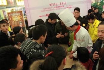 情人节当晚可谓是当仁不让的人山人海,现场的爆棚人气将三楼围堵得水泄不通。同时,非常有看点的就是面塑玫瑰花,据厨师介绍,平常送的玫瑰花都是会凋谢的,但是这个面塑的是永远不会凋谢的,而且还可以食用,非常实在又有含义的礼物,送给女朋友也意味着你们的爱情不用凋谢。