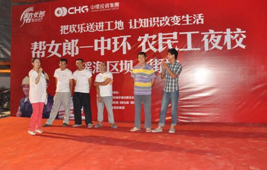 首先,来自中环投资集团大爱中环·志愿服务团的志愿者们为农民工兄弟们表演了精彩的开场舞蹈。据介绍,中环投资集团自成立以来,立志成为受社会尊重的优秀企业,秉承责任源自内心的宗旨,坚持开展各种社会公益活动,关爱农民工、救助服刑人员未成年子女、关注城市特困家庭、构建和谐社区文化、鼓励支持青年就业创业,努力为创新社会管理、构建和谐社会、促进包容发展贡献力量。在关爱农民工方面,中环集团专门成立了“大爱中环·志愿服务团关爱农民工志愿服务队”,为农民工宿舍装空调,送温暖、送清凉、送文化、送教育送医疗到工地,组织农民工与家属游世博,给农民工树立雕塑群像,建立工地农民工团组织和图书室,让农民工最终扎根融入城市生活,成为现代化城市建设的主任,成为城市文明的共享者。