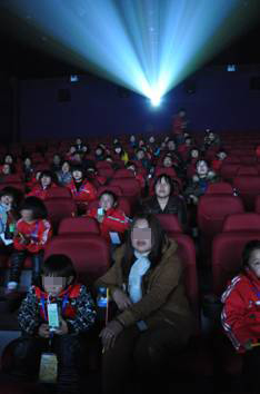 “以前从没进过电影院,屏幕好大啊,电影真好看!以后,希望爸爸妈妈一起带我来看电影。”14岁的媛媛(化名)家在安徽阜南县农村,四年前,父亲犯了抢劫罪被判入狱。家里没了顶梁柱,原本贫困的家庭更加不堪一击。媛媛和其他来自贫困服刑人员家庭的孩子们一样,都是第一次在电影院里看电影,电影一开始,他们开始目不转睛的盯着电影屏幕。