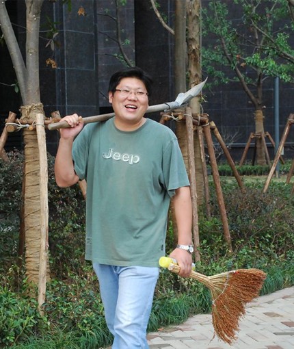 交付的前一天,在全员中环城卫生清洁活动中,老季负责打扫紫荆公馆园区。