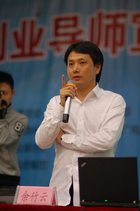 在回答就业与创业关系的问题时,余竹云认为首先要创业,才能为扩大社会就业创造载体,为社会发展作出贡献。有学生提出,目前在中国的文化环境中,很多创业者难以承担失败的压力。余竹云表示,不能怪别人,不能怪这个社会。当今中国社会已足够开明、开放。创业者首先应做好充分的思想准备,要有面对失败的心理承受能力,拥有一个良好的心态,即使创业失败了,创业经历本身也是青年成长的宝贵财富。他说自己创业的时候也是历经艰辛,不到黄河心不死,没有抗压能力与坚持不懈的精神就不可能有今天的余竹云。他呼吁这个社会能更多关心支持创业青年,多一点理解包容。