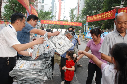 两排整齐的党史展板,一圈鲜红的庆祝标语条幅让东方名景小区入口充满了节日的气氛,也引来了不少过往居民的参观。2011年6月28日,中环投资集团构建和谐社区志愿服务队的队员们制作了几十块党史展板和企业文化展板,整齐的排放在东方名景小区入口的两侧,志愿队员们向小区业主介绍红色文化的同时还向业主们发放无纺布袋,倡议大家节能环保。据悉,中环投资集团还将联合合肥市建委、合肥市工会开展红色电影进社区活动,预计在7月份,将有一场场红色经典在东方名景社区放映。老设备、老片子将为怀旧的人们带去丰盛的红色文化大餐。