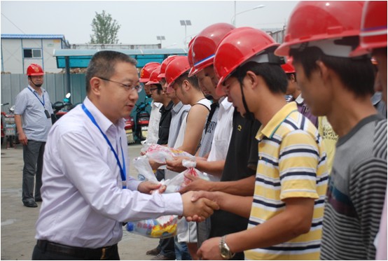 乔总首先代表余竹云董事长向为“中环城”项目建设付出辛勤劳动和汗水的农民工、集团公司的一线员工表示衷心感谢。乔总指出,农民工是我们的合作伙伴,你们远离家乡,来到“中环城”项目建设工地,顶酷暑,战高温,为“中环城”项目建设出力流汗,贡献力量,理应得到尊重和关心。一线员工,特别是保安等员工昼夜在室外作业,天气炎热,风吹雨打,蚊虫叮咬,非常辛苦。关心爱护农民工,关心爱护员工,每年夏季为大家送清凉,送防暑降温用品,是集团公司的传统,是集团企业文化建设的重要内容。希望大家在建设和工作中,要认真负责,保证质量,注重安全,确保工程建设等各项工作任务按计划顺利完成。