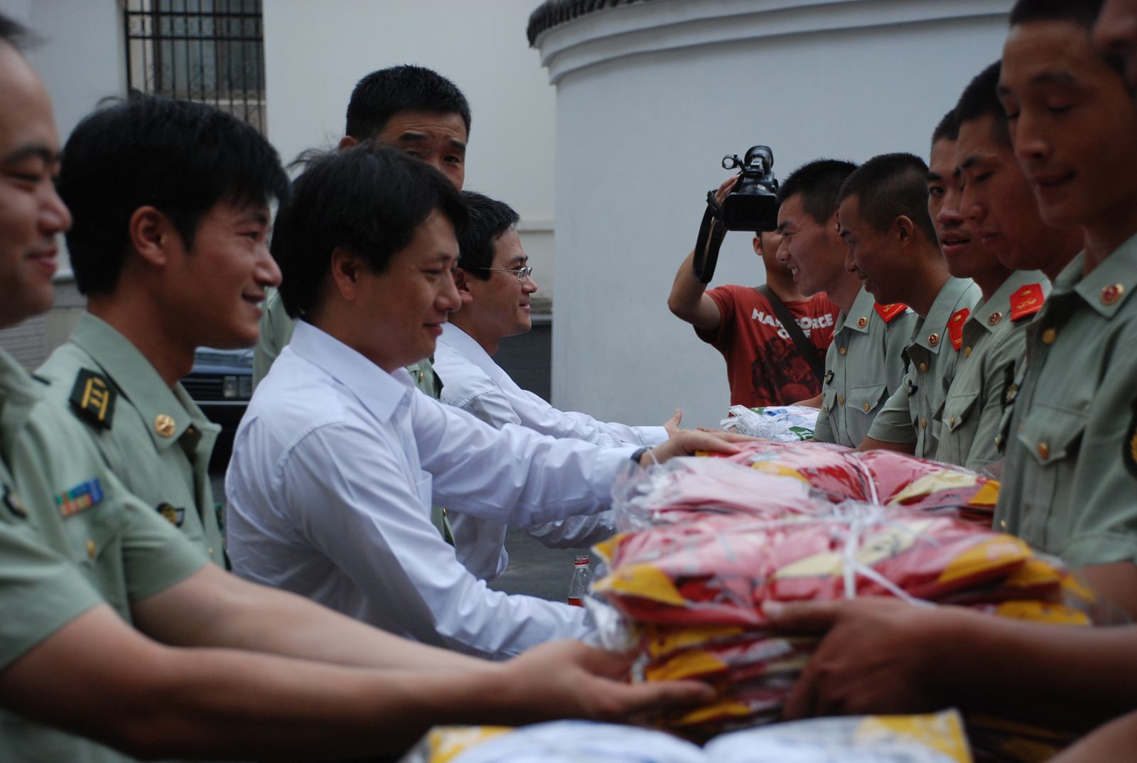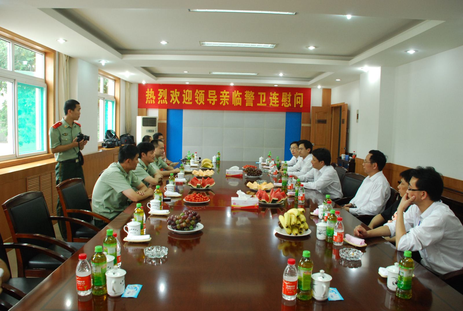 在参观了警卫连荣誉室后,中环投资集团董事长余竹云、集团中心总经理们和警卫连领导们步入会议室,进行了座谈交流。座谈中,省委警卫中队队长卞小寒同志向参会的中环投资集团领导们介绍了警卫连的发展状况和官兵们的生活情况。余竹云董事长回顾了自己当年在警卫连的生活,并赞誉了部队官兵们对社会的贡献,他说,“现在的社会变得很浮躁,很多人一味追求利益之余,将社会主流的价值观早就抛诸脑后,缺少了一些互帮互助的美好品德。每当灾难发生时,部队的官兵们总会在冲锋在第一线,抗难救灾,为社会的安定和谐奉献力量。所以我每年都带着我的员工们到军营来走一走,让他们感受部队的淳朴与真诚。”