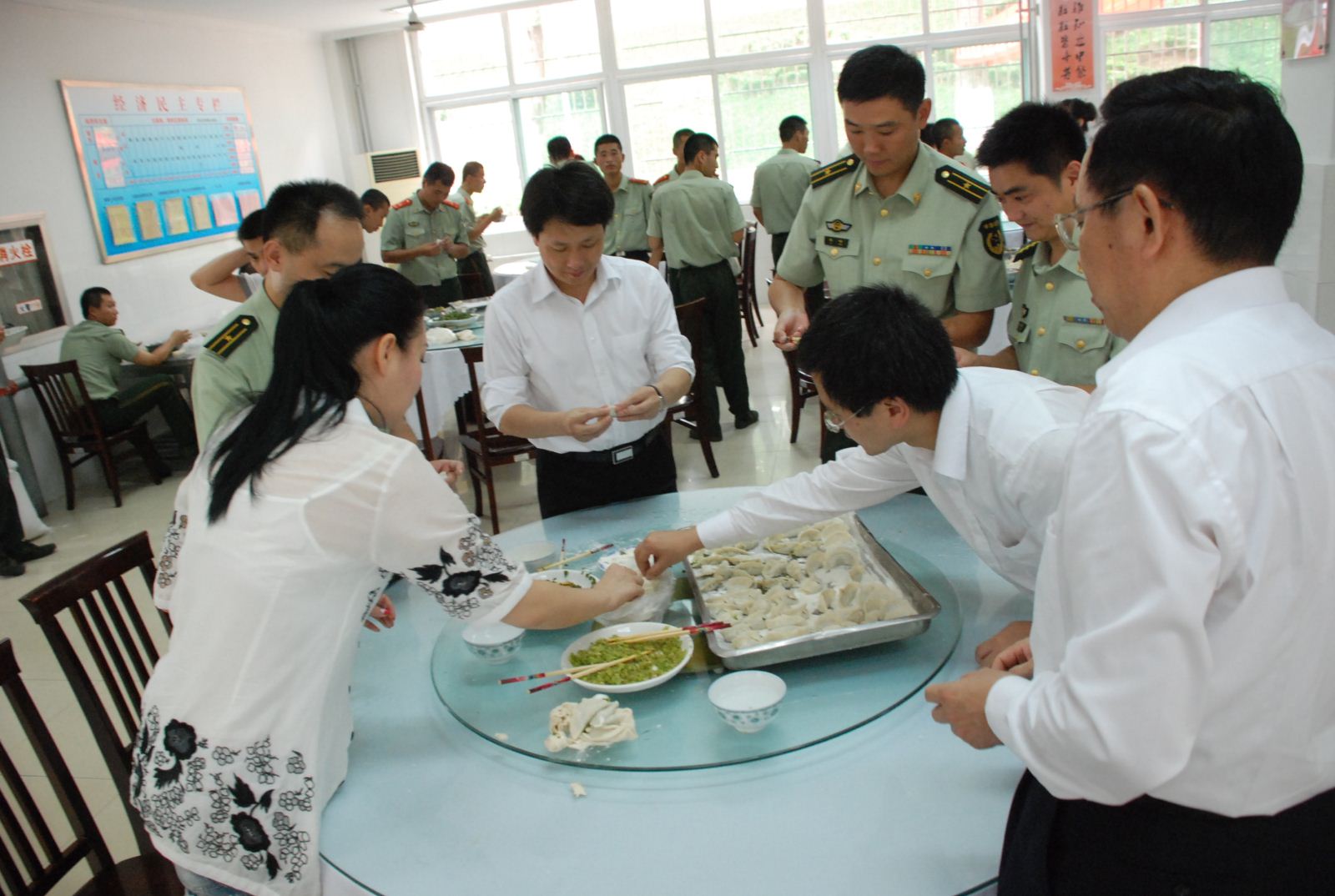 几轮游戏过后,大家转到一楼食堂开始准备中饭,齐齐动手包起了饺子。炊事班的战士小刘笑言:“咱们在部队基本一个礼拜就要包次饺子吃,不过很少能招待客人。”包起饺子来,大家都不甘示弱。你包个元宝,我包个小船。一盘饺子刚包完,那边立刻就下进锅里。等一盘盘地捞上来,大家抢上一碗就开吃,围作一团吃得津津有味。战士们说,他们平时的生活相对封闭,比较单调,今天来了这么多朋友,感觉非常有意思,很开心。