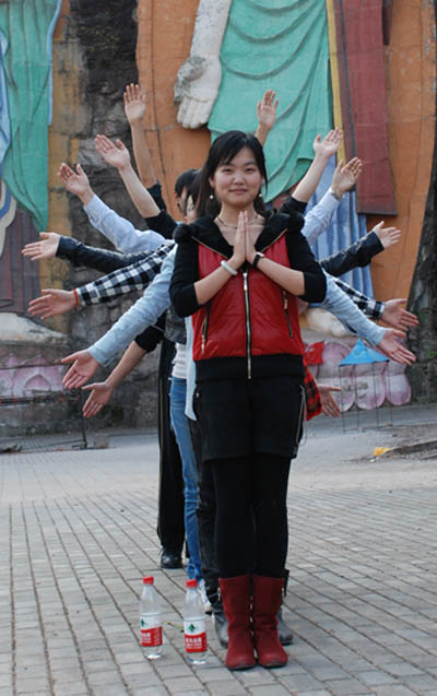 紫蓬山风景区最吸引人的莫过于雕刻在崖壁上的三尊大佛像,在雕像前拍照留念时,中环的通讯员们已经摆起千手观音造型。还别说,通讯员的默契配合让这幅中环千手观音别具风采。