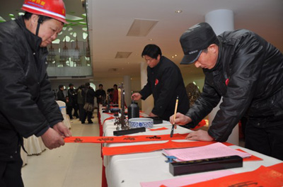 下午四点近40位省内知名书法家来到中环艺术馆现场泼墨挥毫,为项目工地的农民工书写春联,为他们送去新春的祝福。活动现场安徽省青年书法家协会11位主席团成员还向优秀农民工代表赠送了自己的书法作品,在此新春佳节即将到来的时刻,让奋战在城市建设第一线的农民工兄弟感受到了阵阵暖意。