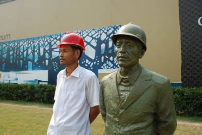 吴昊副主任感慨说道:中环集团不仅产品做的好,更是在承担社会责任方面,令人敬佩,主动作为,为政府分忧,为民工排难,从装空调,送清凉到送文化到工地当电影、捐赠100万元教育设备给农民工子弟学校、中环为关爱农民工,特别是8月8日,中环创全国之先,在中环城艺术广场上以中环城建筑民工为原型,塑造了20位艺术雕塑,为农民工树立丰碑,树立了时代典范。