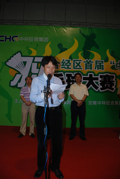当时钟指向8点30分,激动人心的进行曲音乐响彻在场馆内,开幕仪式正式启动,经济开发区管委会副主任李保国,区属各机关负责人陈和平、李应天、何建埠、王刚及各社区委书记参加了开幕仪式,安徽中环投资集团公司董事长余竹云作为特邀嘉宾出席了开幕仪式。仪式由中环集团副总经理黄少铭主持,开幕式上,各位领导发表了热情洋溢的开幕词,并预祝本次羽毛球比赛取得圆满成功,激励运动员要赛出风格、赛出水平。中环投资集团董事长余竹云热情的发言激起了一阵阵的掌声,他表示“我们中环集团一直热衷并支持文化事业的发展,并以推进经开区的文化活动的为己任,衷心祝愿本次大赛圆满成功”。随后,运动员代表和裁判员代表分别庄严宣誓,经开区管委会副主任李保国与中环集团董事长余竹云举行了轻松而欢快的发球仪式,宣布了比赛正式开始。