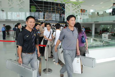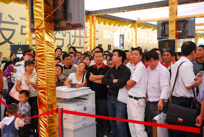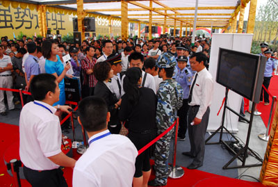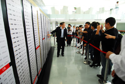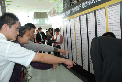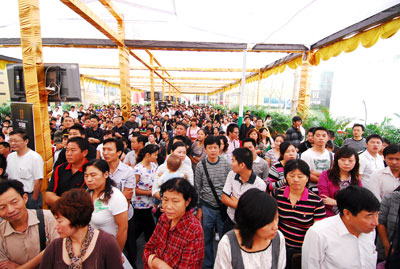 19日上午记者为了记录这一盛况专程赶往开盘现场。远远看见展示中心空飘气球迎风飞扬,沿途彩旗飘飘,现场处处洋溢着浓烈的喜庆气氛。巨大壮观的房源广告牌,把中环城的销售中心装饰得格外醒目。初秋的天气微微乏冷,中环城的现场售楼处却人山人海,整个中环城销售中心内被看房者围得水泄不通,现场气氛异常火爆。为凸显本次开盘的公开、公平、公正,主办方还特地在休息等候区内安置了液晶电视,实时转播整个计算机摇号过程。