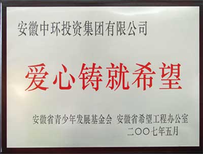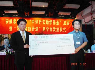 2007年5月21日下午,安徽省希望工程办公室在省少管所小礼堂隆重举行“中环竹云助学基金”成立暨“阳光救助计划”助学金发放仪式。省里对这次捐助活动非常重视,省委常委、政法委书记徐立全出席会议,并为安徽中环投资集团公司颁发了“爱心铸就希望”铜牌。仪式由团省委书记王宏主持,中环集团总裁余竹云,省司法厅厅长孙建新,团省委副书记朱斌等领导分别发表了热情洋溢的讲话。安徽中环投资集团公司总裁助理王昕、人力资源部总监李霞、总裁办公室副主任汪本银,省监狱管理局等单位负责人出席了仪式。