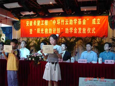 资助仪式上,安徽中环投资集团公司总裁余竹云先生,代表集团向省希望工程办公室捐资50万元,设立安徽希望工程“中环•竹云”助学基金。首批210名特困服刑人员子女得到资助。他们均由安徽全省各监狱摸底审查后,报经省监狱管理局审核产生。