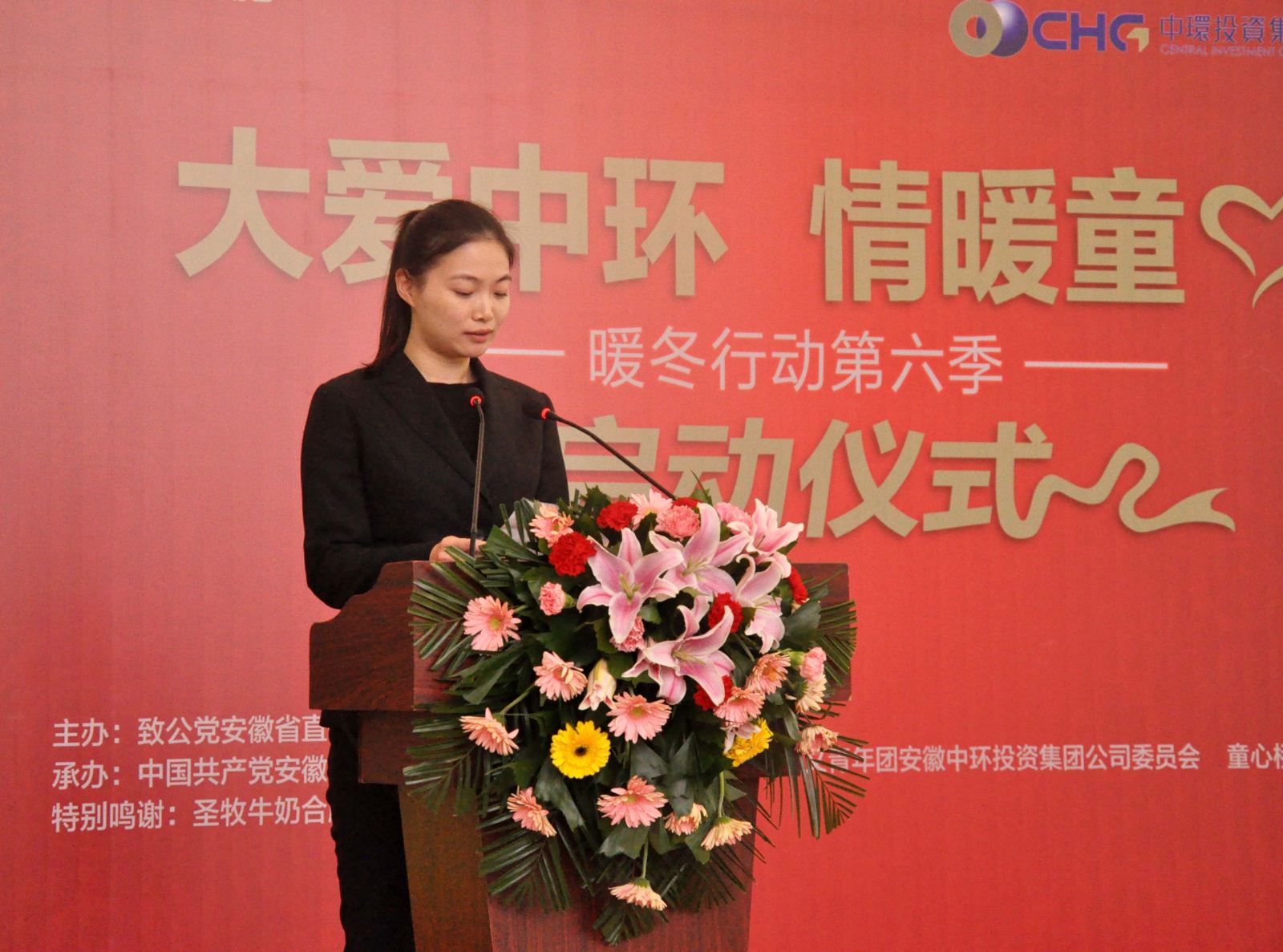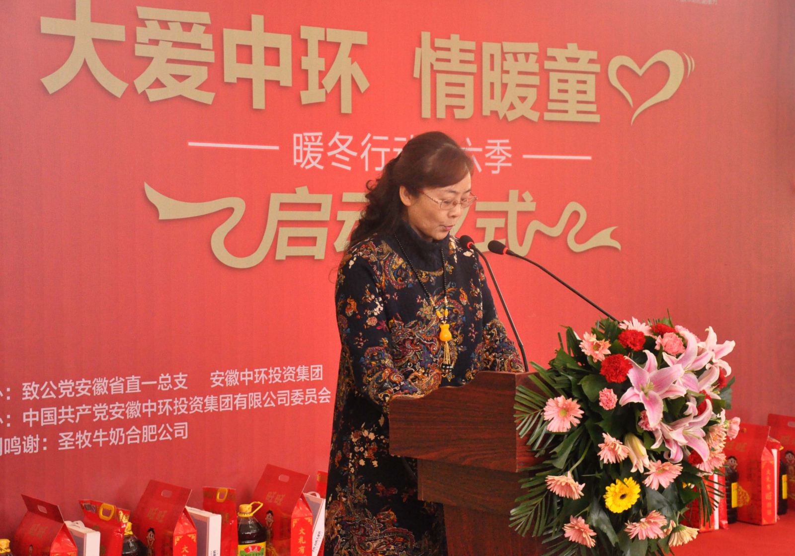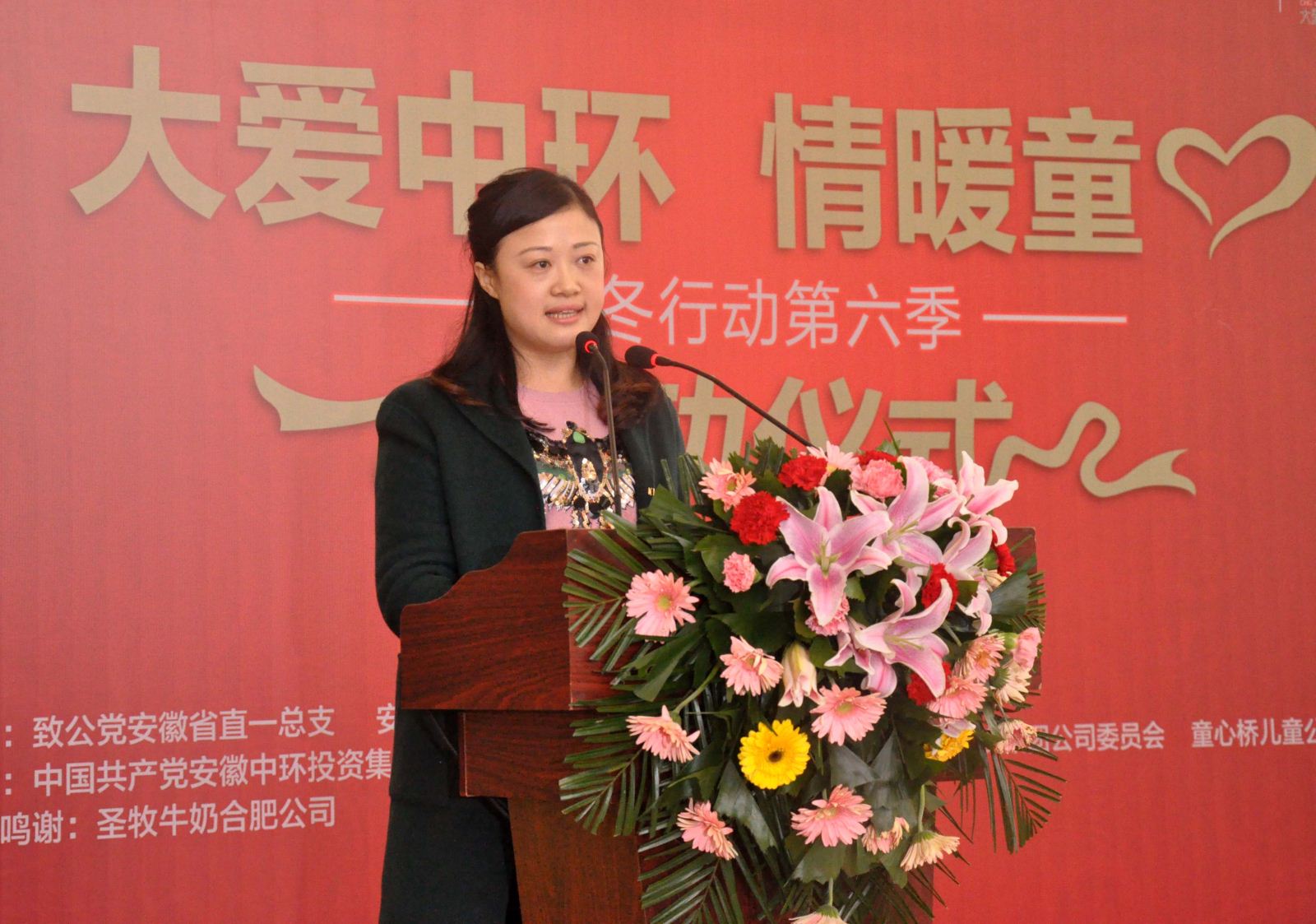 致公党安徽省直一总支副主委刘茹随后致辞,她表示,中环投资集团热心慈善与公益事业,在董事长余竹云的带领下,积极承担社会责任,受到了社会各界的广泛关注和赞誉。童心桥儿童公益发展中心也一直热心帮助残障儿童。本次活动,致公党的党员将同大爱中环志愿服务团的成员一起,将温暖送到孩子们的手中,让他们的冬天不再寒冷。