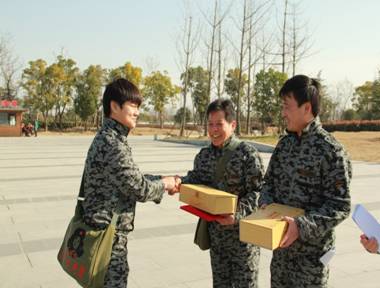 三连连长孟超为“服从命令,听从指挥奖”获奖人员颁奖