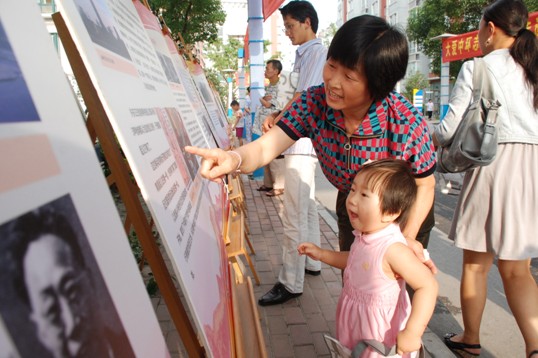 两排整齐的党史展板,一圈鲜红的庆祝标语条幅让东方名景小...