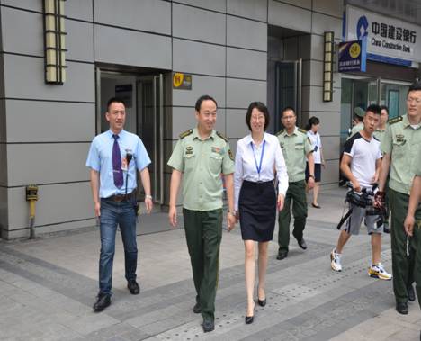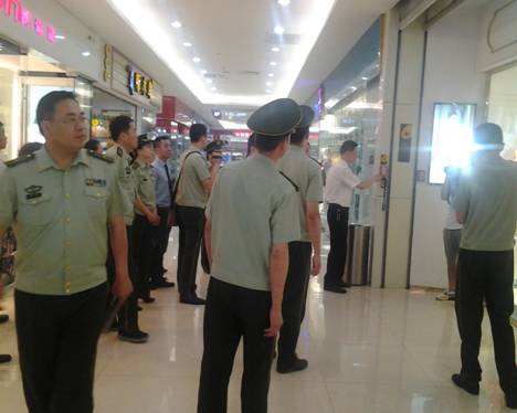 商管公司副总经理赵晖向刘青杰大校一行介绍购物中心消防安全管理工作