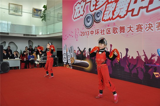 据介绍,中环社区歌舞大赛舞蹈组的预决赛于2013年12月14日下午在中环城云邸小区举行。来自云邸小区的田桂英阿姨是第一个上台表演的选手,从来没有在这么多业主邻居面前跳舞的她显得有些紧张,但是当熟悉的音乐响起时,她便忘了紧张,找回平日里自信的样子,满脸笑容的为大家跳了一曲《红梅赞》,博得了观众的阵阵掌声。最引人注目的当属来自东方名景的夏凡和钱湘两位小朋友了,他们是全场年龄最小的选手,但是别看人家身子小,爆发的能量却很大,一曲民族舞蹈《好日子》跳的有模有样,动作、表情都堪比专业演员,精彩的表演不仅征服了观众,也让评委位置倾心,最终她们成为本场比赛的亚军。